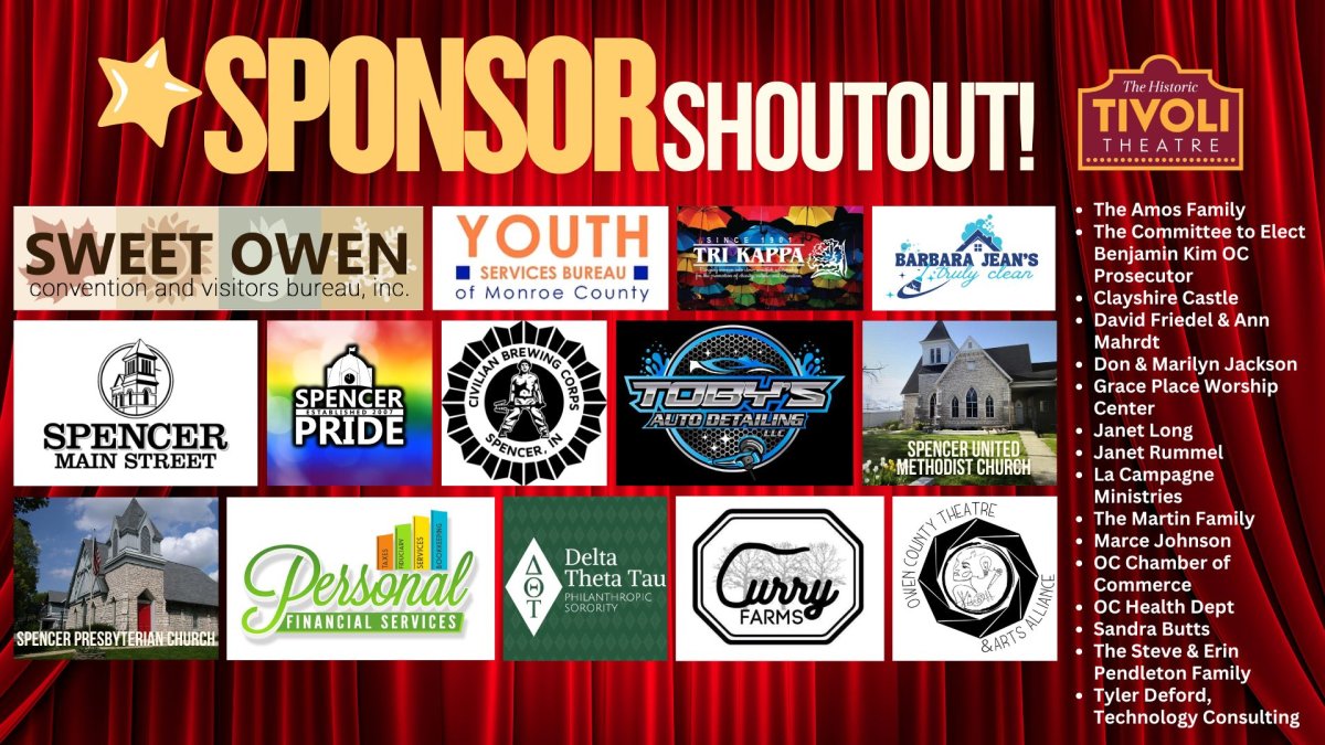 The Tivoli Theatre is owned by Owen County Preservation, a non-profit 501(3)c organization. Tickets and concessions sales are only 74% of our gross income. The survival of the Tivoli depends on your attendance and your generous donations.